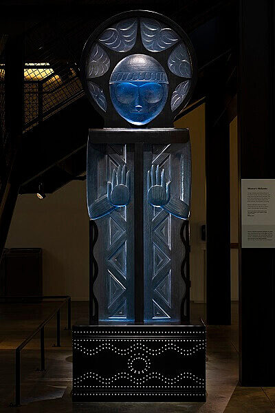 This figure welcomes guests to the Burke Museum in the tradition of similar iconic figures that have stood on the shores of the Salish Sea for generations. Symbols used on this piece are found in many historical objects in the Burke's collection, including baskets and carvings.