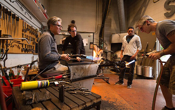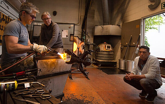 Preston is working with Harlan to create vessel forms and figures similar to his pottery work, then translating his painted designs to sandcarved motifs. This is truly a unique collaboration for the studio. We can't wait to see how the pieces turn out!