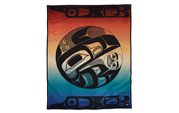 From Pendleton’s website: ”This intriguing blanket is based on a work by internationally renowned glass artist Preston Singletary. Mr. Singletary grew up in the Pacific Northwest – both of his great-grandparents were full-blooded Tlingit Indians. His works explore traditional images and legends of his Tlingit heritage translated into glass. The image on this blanket represents Raven, a shape shifter and trickster who often employed crafty schemes to achieve his goals. In the story, the old chief who lived at the head of the Nass River kept his precious treasures – the sun, the moon and the stars – in beautifully carved boxes. Raven steals the light, and making his escape carries the sun in his mouth. The sun is a metaphor for enlightenment or knowledge. The ombred background shades meet in the center in vibrant colors of sun and light. Mr. Singletary’s artworks are included in museum collections from the National Museum of the American Indian in Washington, DC to the Handelsbanken in Stockholm, Sweden. He is a member of the Board of Trustees for the Seattle Art Museum. A portion of the proceeds from this blanket will be donated to the American Indian College Fund to help support tribal colleges. Unnapped. Felt-bound. 82% pure virgin wool/18% cotton. Dry clean. Made in the USA. 64 x 80 inches.”