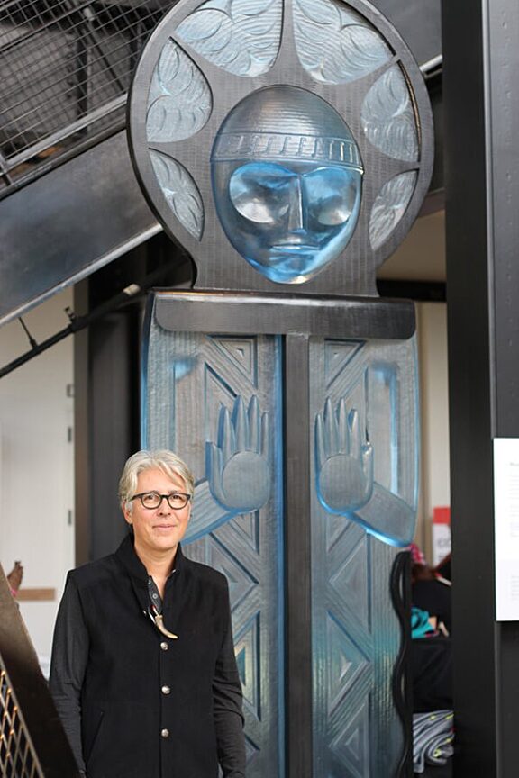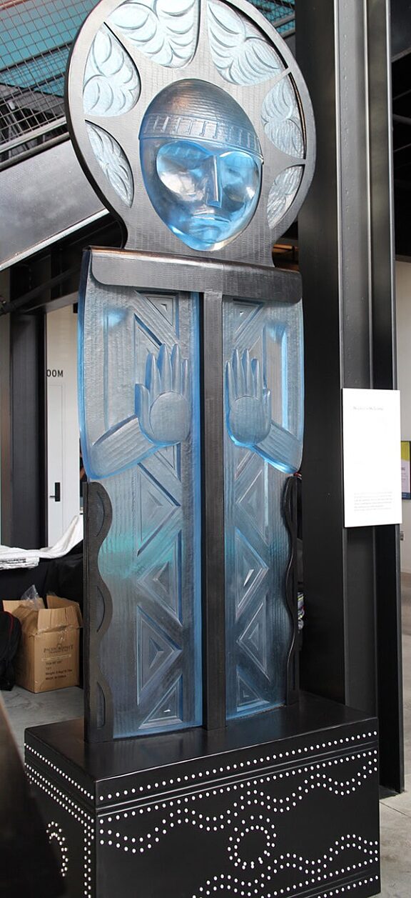 Via artist Anthony Jones, “The ten foot tall human figure is designed in a classic Coast Salish style, reminiscent of historic welcome figures and interior longhouse posts found throughout the Salish Sea region. The figure greets guests with raised hands and upward-facing palms, in a traditional Coast Salish sign of welcoming. The relief carving incorporates classic Coast Salish design motifs using crescents and trigons.”