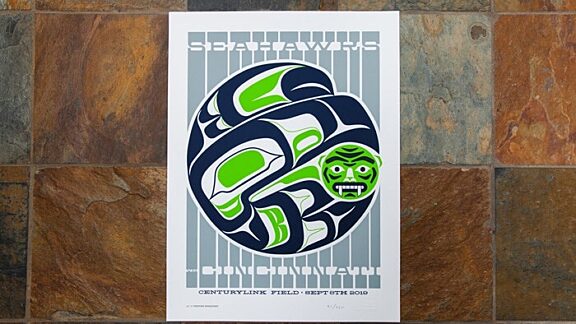 This sold out poster features art by Preston Singletary and was designed by Ames Bros. Included as the first poster in the new Seahawks Gameday Posters series, offering fans an exclusive limited-edition keepsake featuring designs by local artists.