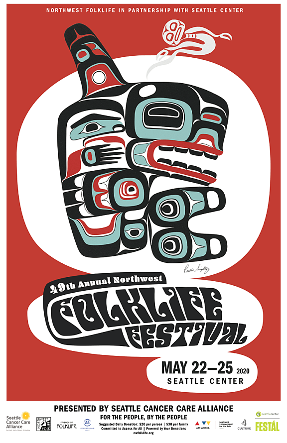 This poster features art by Preston Singletary and was designed by Mike Strassburger. As part of the 49th annual Northwest Folklife Festival, this year’s cultural focus is Living Legacies. As Northwest Folklife looks ahead to celebrate its 50th Anniversary in 2021, it is the stories and traditions of the region that serve as the foundation and significance behind their organization and work.