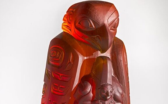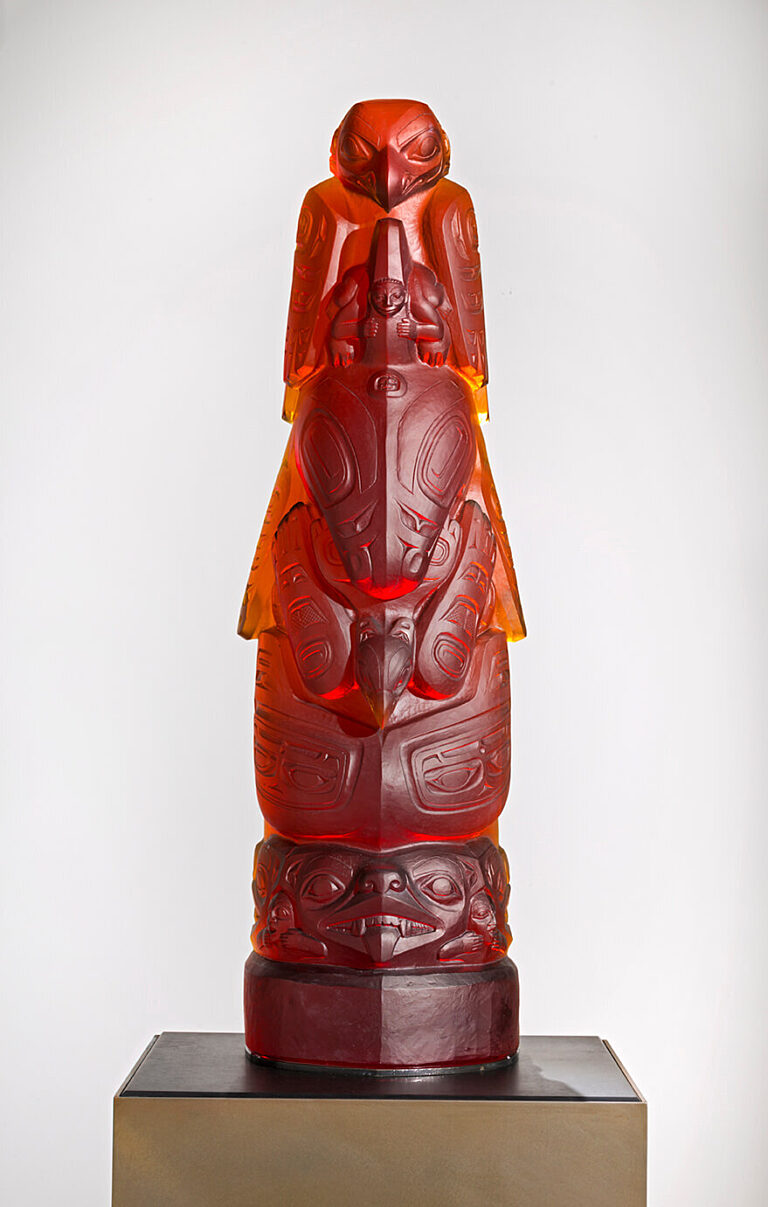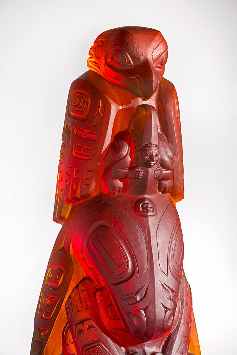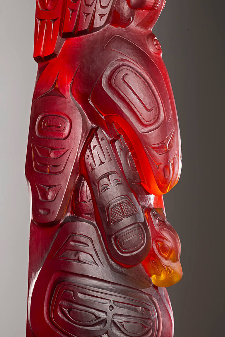 Introducing the newest totem piece by Preston Singletary, the “Killer Whale Totem”. This totem includes his moiety (Eagle) on top, and Singletary’s clan crest (the Killer Whale) in the center. A Thunderbird, emerges from the mouth of the Killer Whale. This Thunderbird represents David Swenson’s crest symbol, Svenson is the carver of the original wooden totem pole version and one of Singletary’s mentors. At the bottom of the totem is the Wolf design, the original moiety for the tribe, which was replaced by the contemporary depiction of an Eagle.