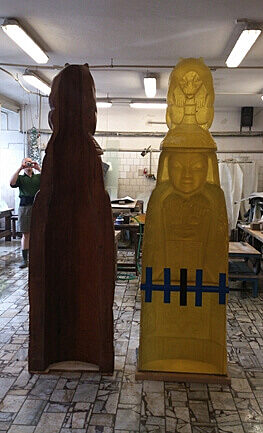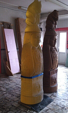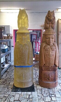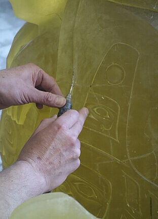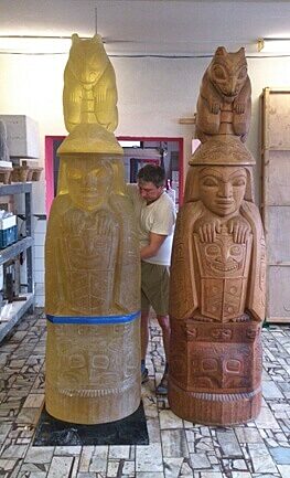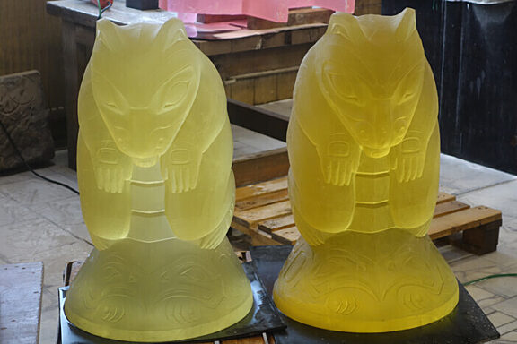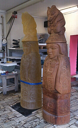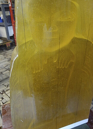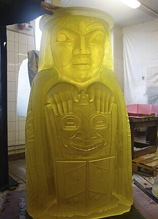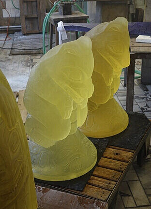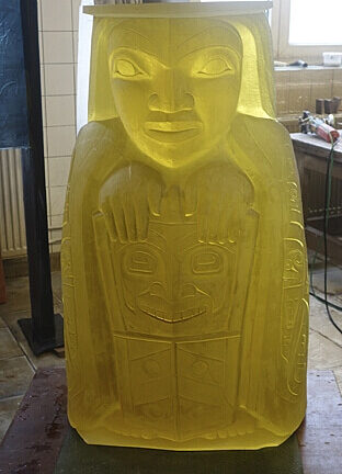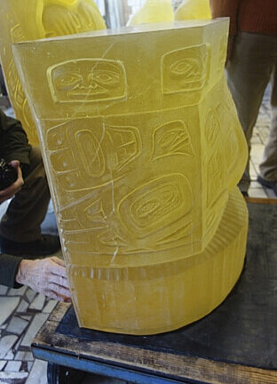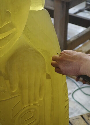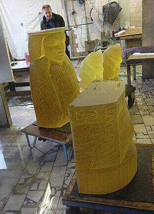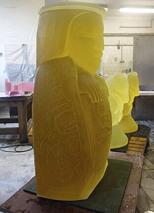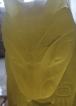 The photos show the Czech technicians cleaning up the surface of the totem, to allow the original carving marks to be more prominent. They have spent the last 6 weeks completing the surface preparation and testing the glass for stress and structural integrity. The photo of the two top sections (the bear on the hat) show the variation in color that happens when the back of the totem section is hollowed out, as in a traditional carved totem. Preston has decided the richness of the color of the solid version is preferrable.