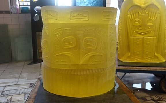 In Spring 2012, after several months of attempting to cast the totem in glass, FireArt Glass in Portland was unable to create a successful version. The sheer volume of glass required to cast a totem of this size makes it not only difficult to manouver, but extremely volatile to cool evenly. The type of glass used at FireArt may also have been a factor in the instability of the totem.