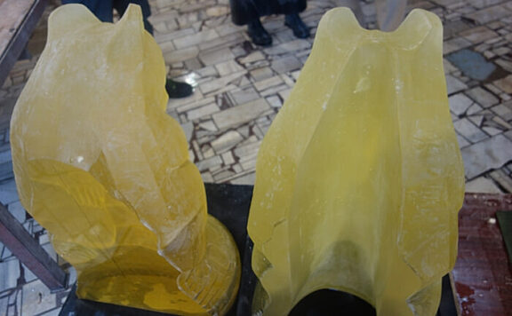 They used a tested and approved method of casting monumental glass that was pioneered for massive pieces by Jaroslava Brychtová and Stanislav Libenský in the 1950s. They used a special kind of lead crystal to cast the totem, in a vivid light amber color, which would allow for the best light transmission and internal refraction. It would also be much less likely to form bubbles during cooling in the annealer, but this feature came at a cost: the totem sections would have to cool in the annealer for three months. During that time, the technicians would not be able to check on the sections to see if they had cooled correctly or exploded due to instability.