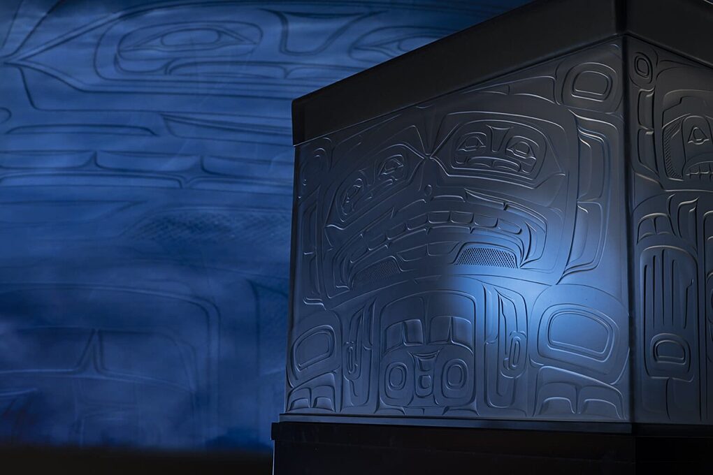 The story unfolds as visitors move through the exhibition’s four environments, while listening to recordings of storytellers paired with layers of original music and coastal Pacific Northwest soundscapes. Singletary’s art creates a theatrical atmosphere in which his striking glass pieces enhance the narrative of Raven and the Box of Daylight.