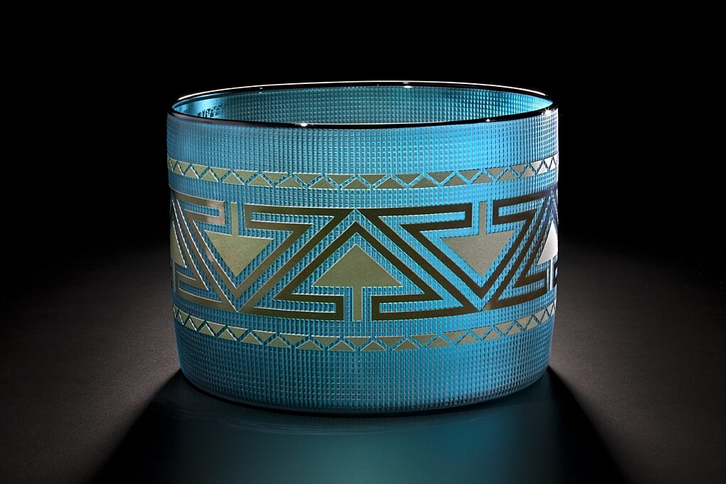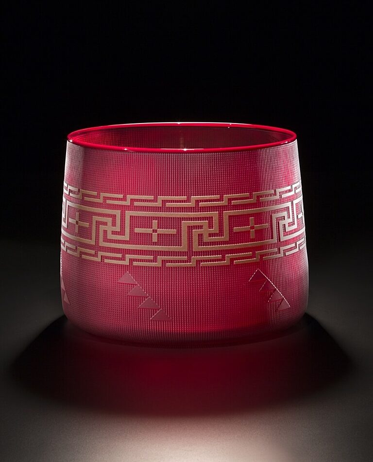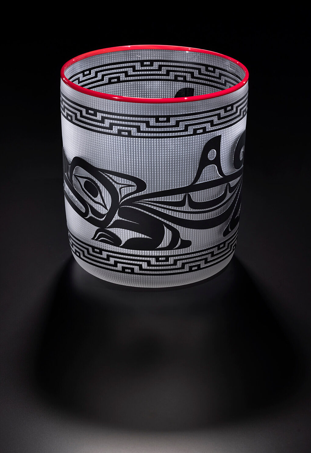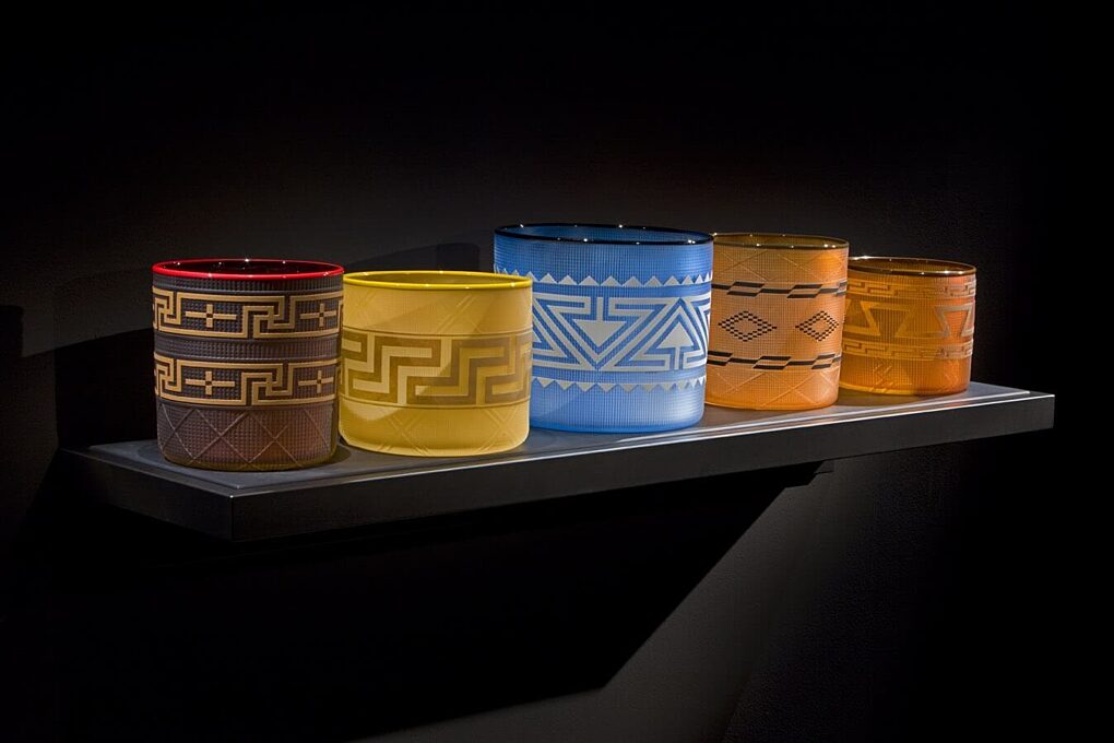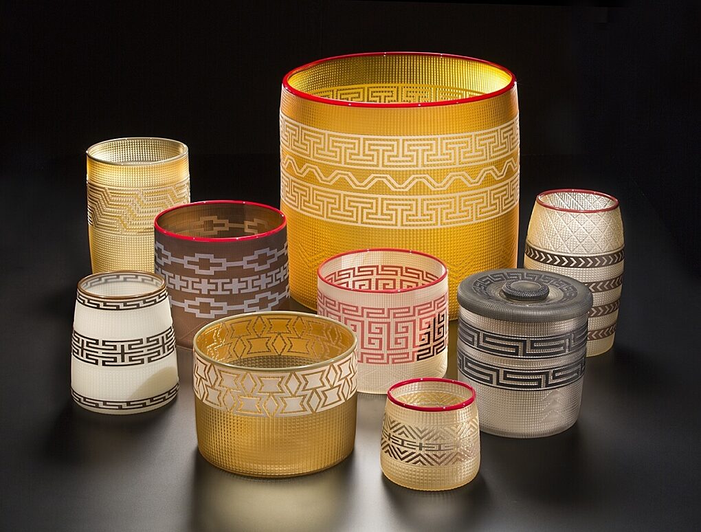 A selection of Tlingit Baskets created in blown and sand carved glass that Preston Singletary has created over the years. The baskets that Singletary creates are contemporary glass versions of traditional Tlingit baskets, which were woven from spruce tree roots.