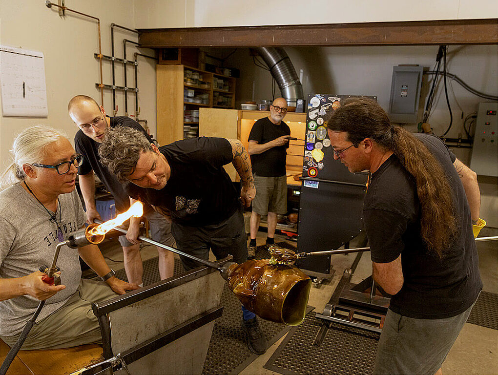 During the cooler months the Studio hot shop fires up the furnace to create art for the rest of the year. If you've ever been curious about the glass blowing process, from gathering glass to the annealer, then now’s the time to tune in.