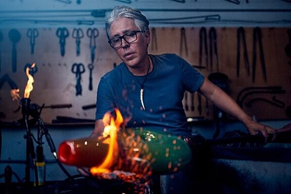 Preston Singletary began his journey as an artist in his hometown of Seattle in the 1980s, and he is noted for melding of European glass blowing traditions with his Tlingit culture, and iconography.