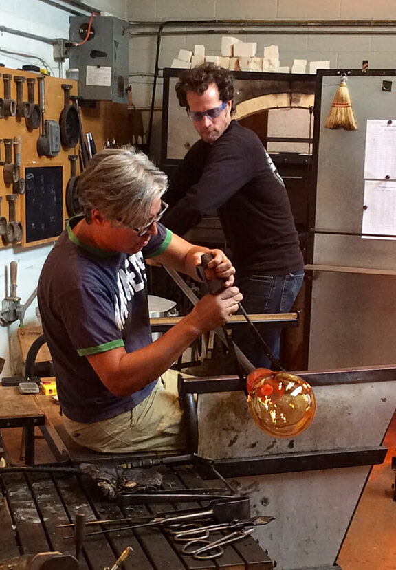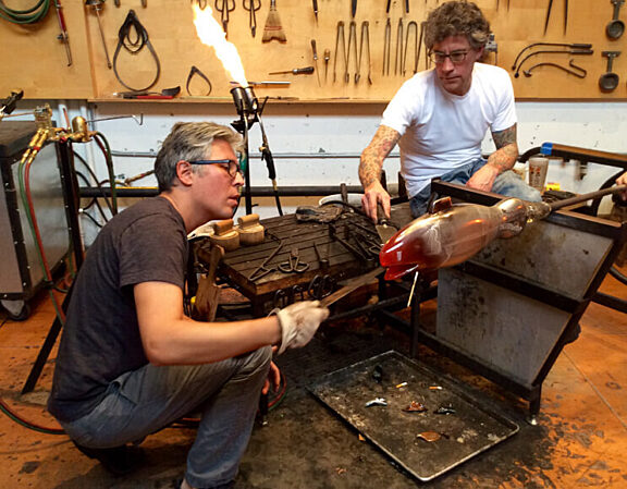Preston Singletary regularly works in his Studio hot shop creating new pieces for upcoming gallery and museum exhibitions. Joined by an experienced team of skilled artists Singletary is able to expand upon his work in blown glass. Below are photos of recent hot shop creations.