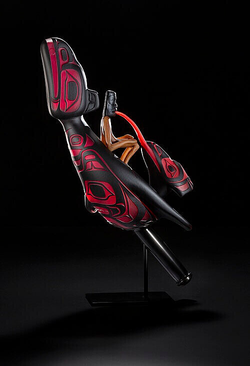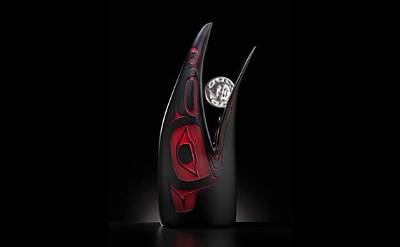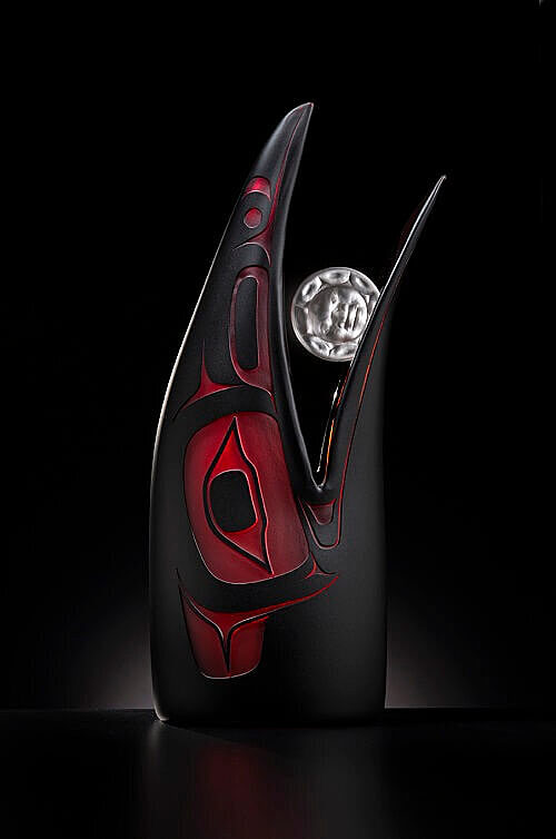 Per MIAC: “The artists have melded the aesthetics and properties inherent in glass art with their cultural ways of knowing, whether re-interpreting traditional stories and designs in the medium of glass, or expressing contemporary issues affecting Indigenous Nations.”
