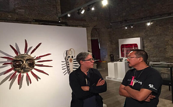 An innovative exhibition of contemporary Alaskan art has arrived at the Château Musée Boulogne-sur-Mer in France. Organized by Alutiiq artist Perry Eaton, a large selection of works by twenty-nine contemporary Alaskan Native artists will enter the collection of the museum, one of the first collections of this type in Europe. The exhibition, titled "D'une culture a l'autre" — "From One Culture to Another", brought Preston Singletary to France as an artist included in the exhibit.