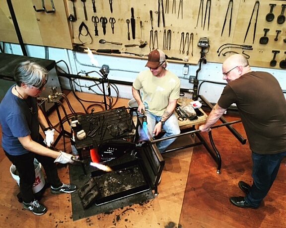 Take a behind the scenes look at the Preston Singletary Studio hot shop team as they work on new pieces created in blown glass. Pictured below are Preston Singletary, Sean Albert, Janusz Pozniak, Ross Richmond, and Dave Walters. Photos courtesy of Preston Singletary Studio.