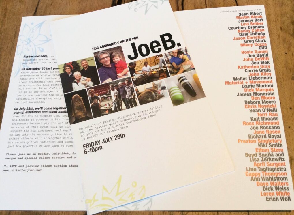 An art exhibition and Silent Auction will be held at the Traver Gallery in Seattle on July 28th from 6-10PM. Glass artists in the Seattle community and beyond will come together to donate their work. This is the culminating event of our fundraising efforts. 100% of the funds raised during this event will go directly to Joe, providing vital support of his treatments and recovery.