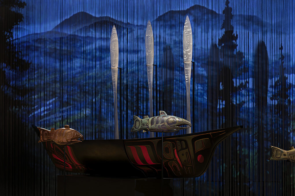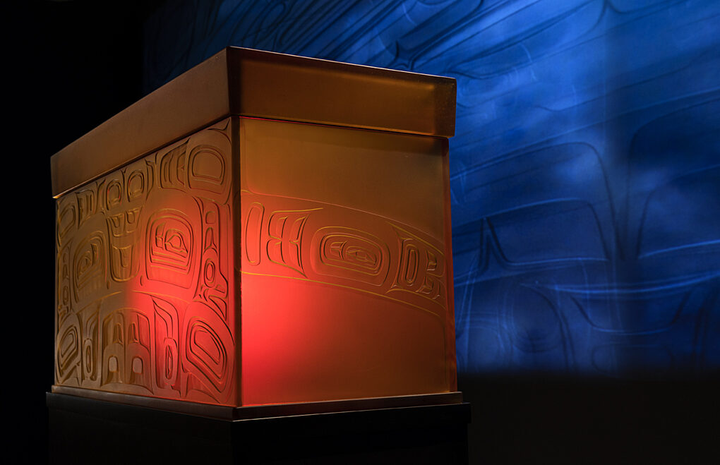 For each area, the exhibition is composed of complementary elements of glass artwork, sensory details, audio-elements, and installations to immerse the visitor in an experiential journey. This exhibition was supported by the research of Walter Porter, a Tlingit mythologist and historian. Porter’s research provides a unique perspective about Tlingit cultural stories. He was well known for his comparative work regarding other cultures’ mythologies surrounding the Raven story.