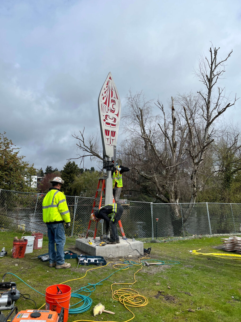 Artist team Preston Singletary and David Franklin have just completed a new public art sculpture. Their artwork tells the traditional native story of "Petrel Guards the Water" and "Raven Steals the Water" through two large-scale canoe paddle sculptures constructed of glass and steel that flanks each side of the ship canal waterway in Seattle, WA. Opening Celebration will occur with the opening of the Ship Canal Water Quality Project completion.