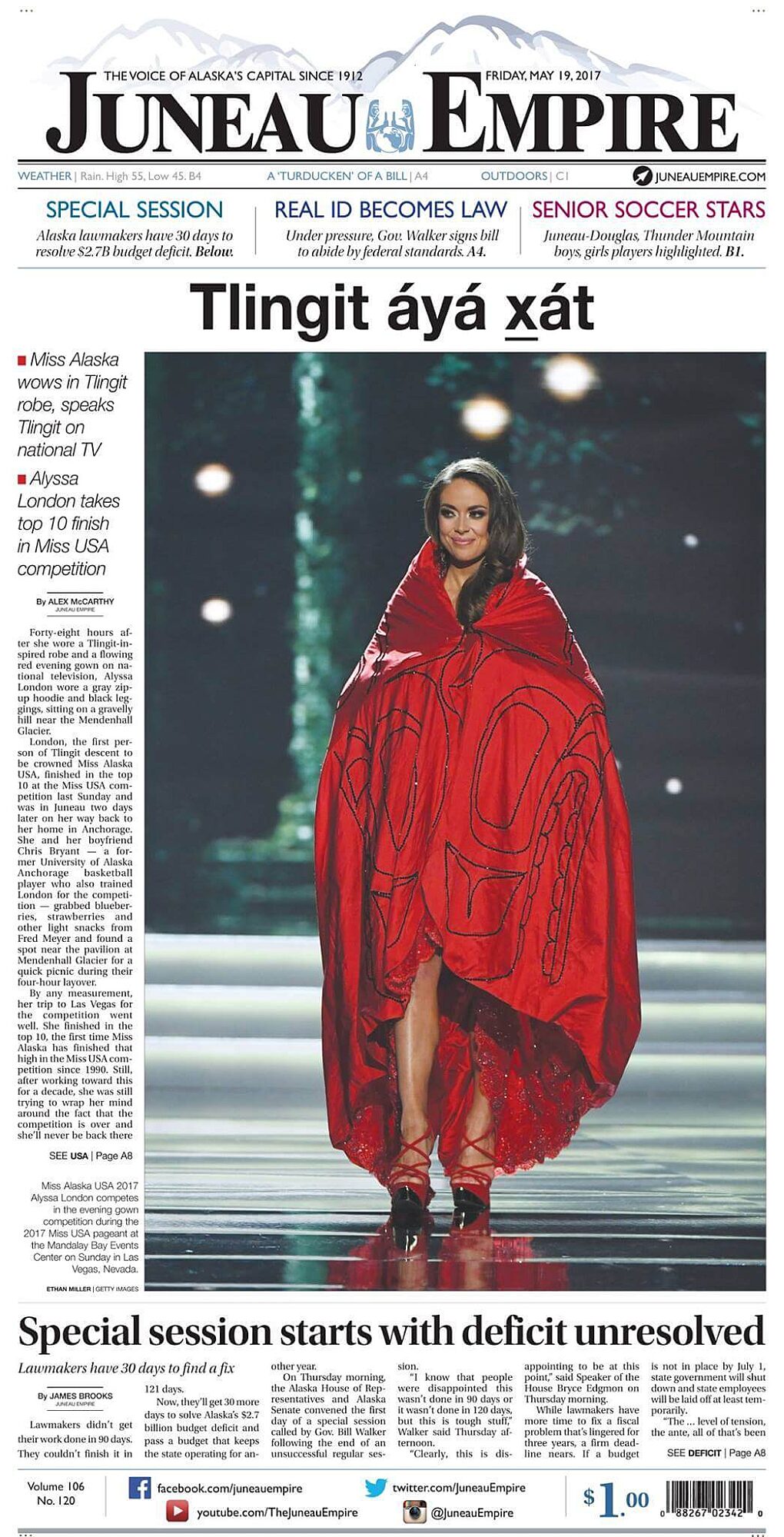 During an interview with Anchorage Daily News Preston Singletary describes how incorporating London's heritage into her gown "was challenging, but exciting at the same time. I really wanted it to be a big success for her. I do formline design work all the time. It reoccurs throughout all the designs we do in woodcarving, textiles."