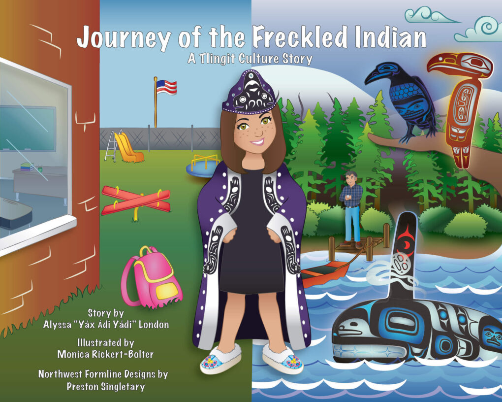 Cover of the book "Journey of the Freckled Indian" by Alyssa London, with formline designs by Preston Singletary.