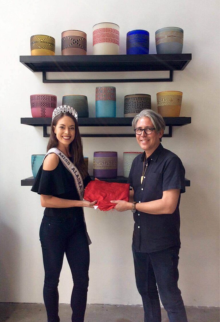 This transformational Swarovski crystal-beaded evening gown was worn by Alyssa London, Miss Alaska USA, during the 2017 competition. The formline design of a killer whale representing London's clan was done by Preston Singletary, and was designed and constructed by Joey Galon Atelier in Los Angeles. This piece currently resides in the collection of Sealaska Heritage.