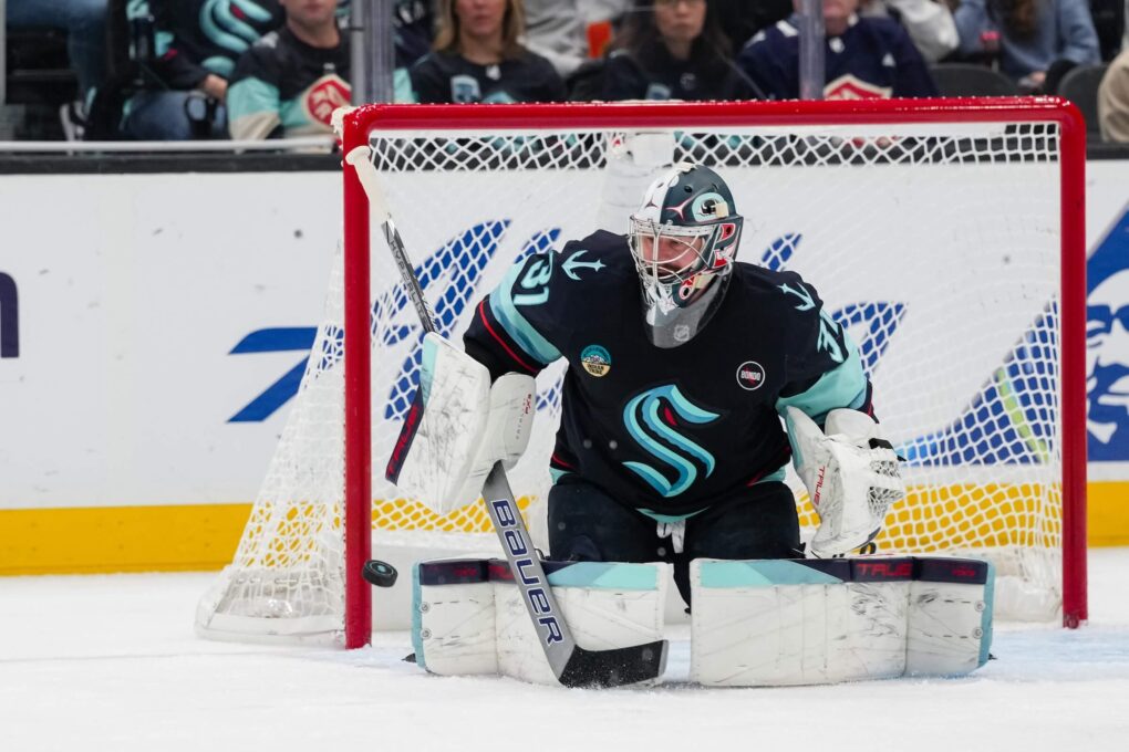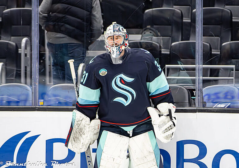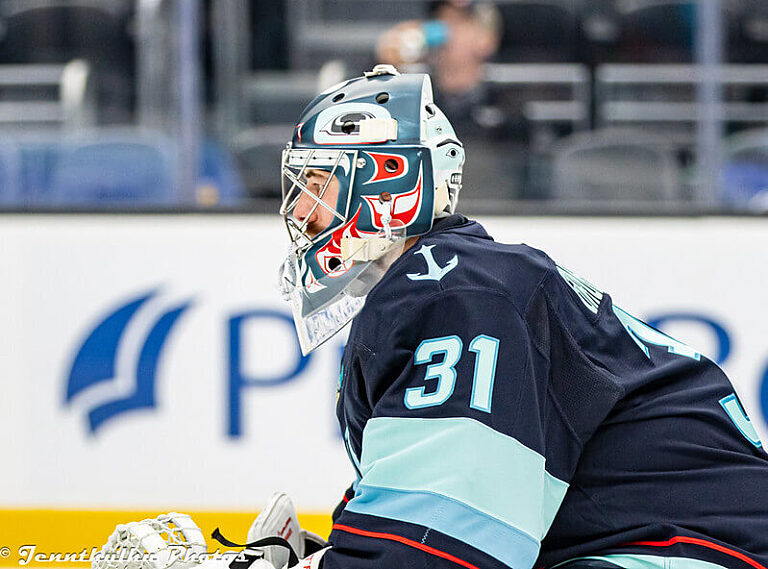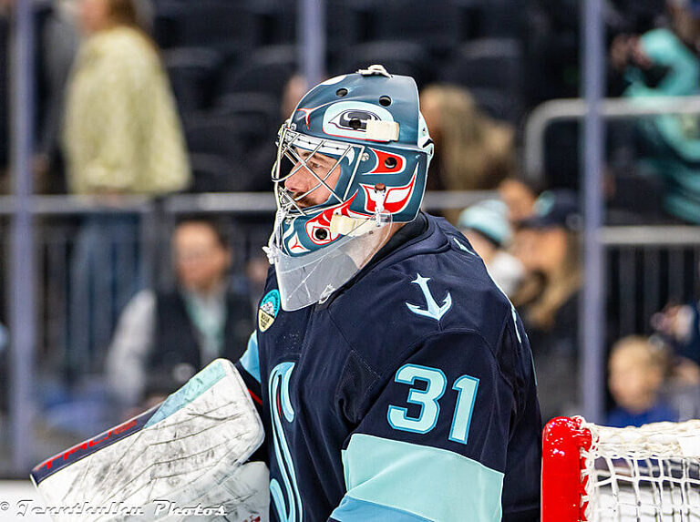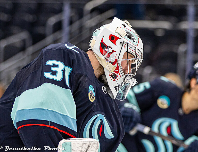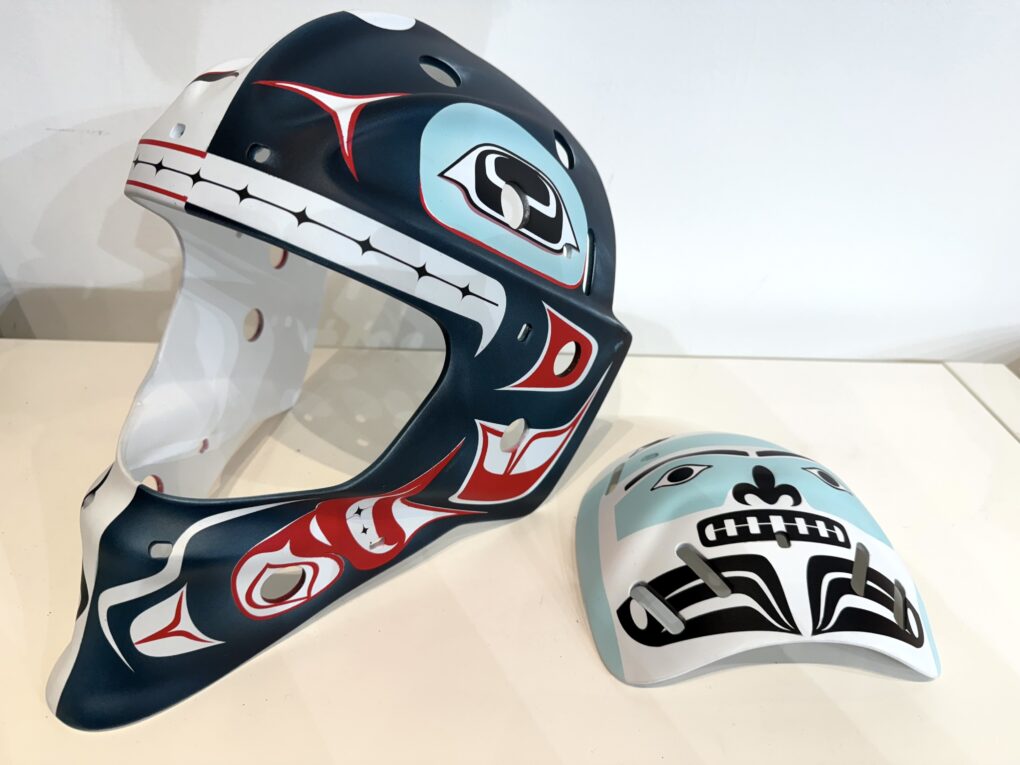 Preston Singletary was selected to design a mask for the Seattle Kraken for their Indigenous Peoples Night in December 2024. This hockey mask features a Killer Whale design and was worn by Philipp Grubauer. The mask was painted by Ty Juvinel.