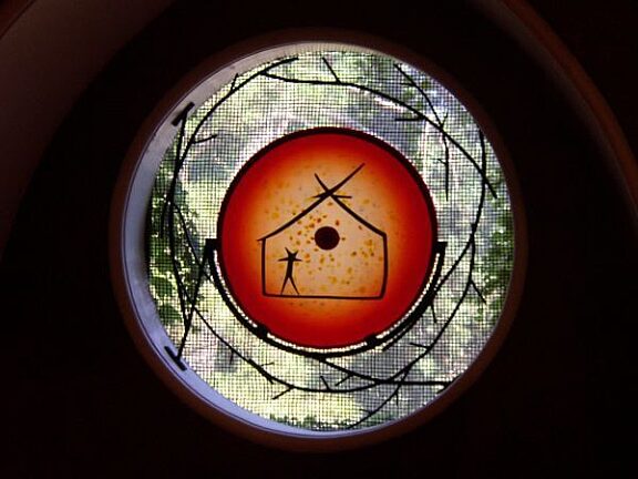 Created in fused and leaded glass, this window is located in St. Paul's Cathedral in Oklahoma City. The congregation of St. Paul's commissioned Preston Singletary in 2004 to create a stained glass window featuring Oakerhater's glyph.
