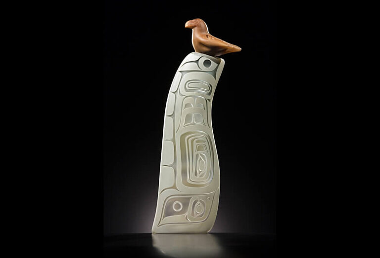 Essential to Singletary's work is the way in which his sculptures connect him to both the present and the past. Aesthetically, he calls our attention to these distinct yet connected temporal realities by elegantly melding the traditional form-line design and iconography with contemporary forms, colors, and gestures. It is through these aesthetic assertions that he captures our attention and compels us to look closely, to "hear" his stories and family legends.