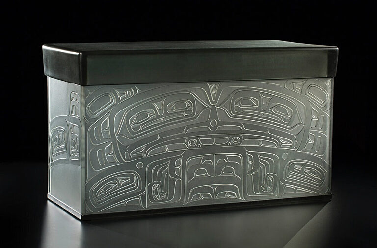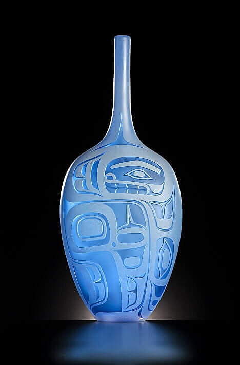 View works by Preston Singletary in blown and sand carved glass. On view from April 7th - 30th 2016 at Traver Gallery.
