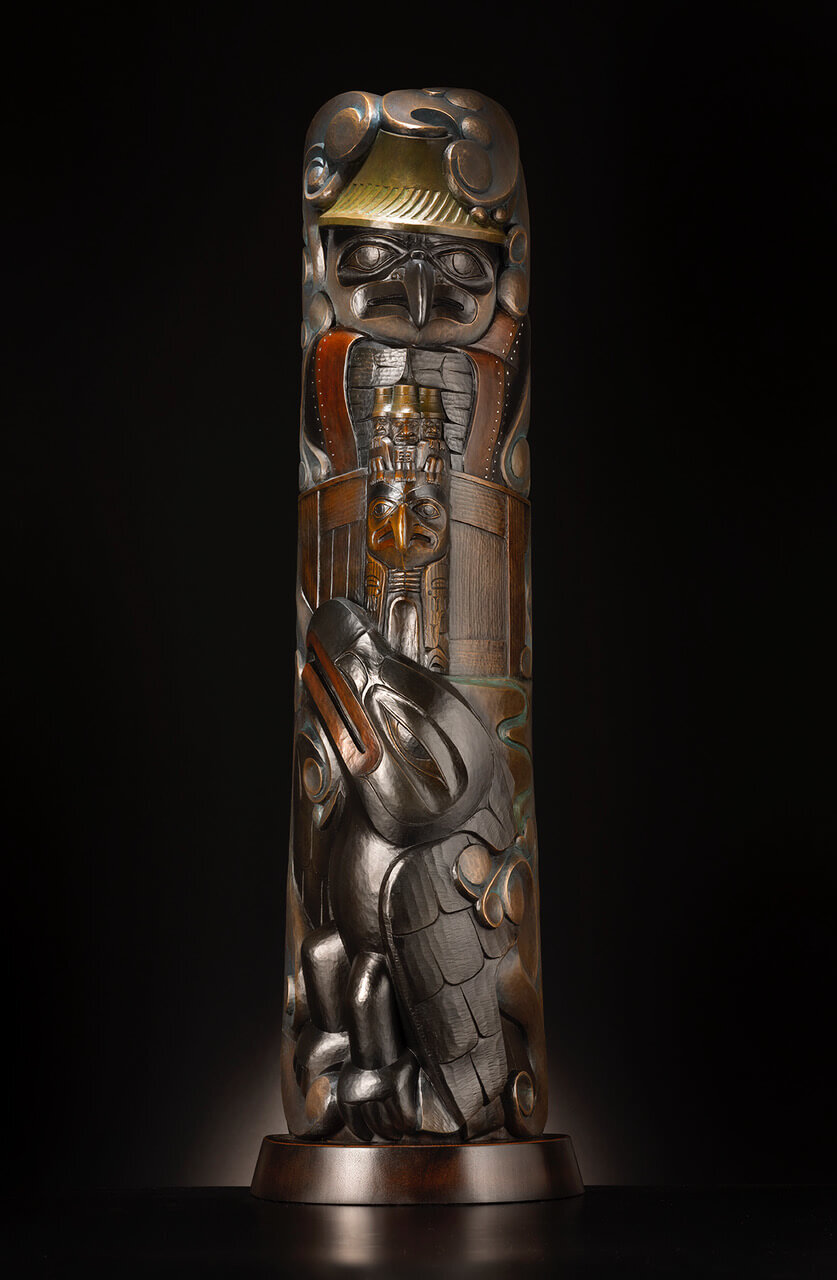 This limited edition bronze is based on the story of Fog Woman, which begins with Raven going to the Sky World and convincing Fog Woman’s father that they be allowed to marry. The father agrees and says that he should always treat his daughter with love and respect. However, as time goes by, Raven forgets his promise to love and cherish his wife, things get tougher and it is a time of famine.
