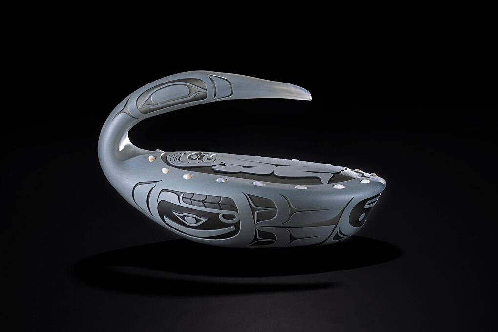 This exhibit highlights the Modernist influences on Singletary's Tlingit ancestry, and cultural objects. He has long been influenced by the Modernist movement in art and how those artists were inspired by Native art, Oceanic and African art. This collection of pieces show organic forms that relate to modernist and minimalist sculpture, but are adorned with Tlingit design work to create Singletary's version of Ancient Modernism.