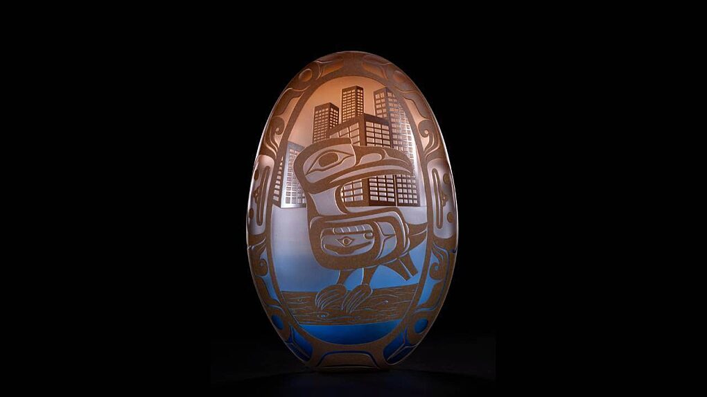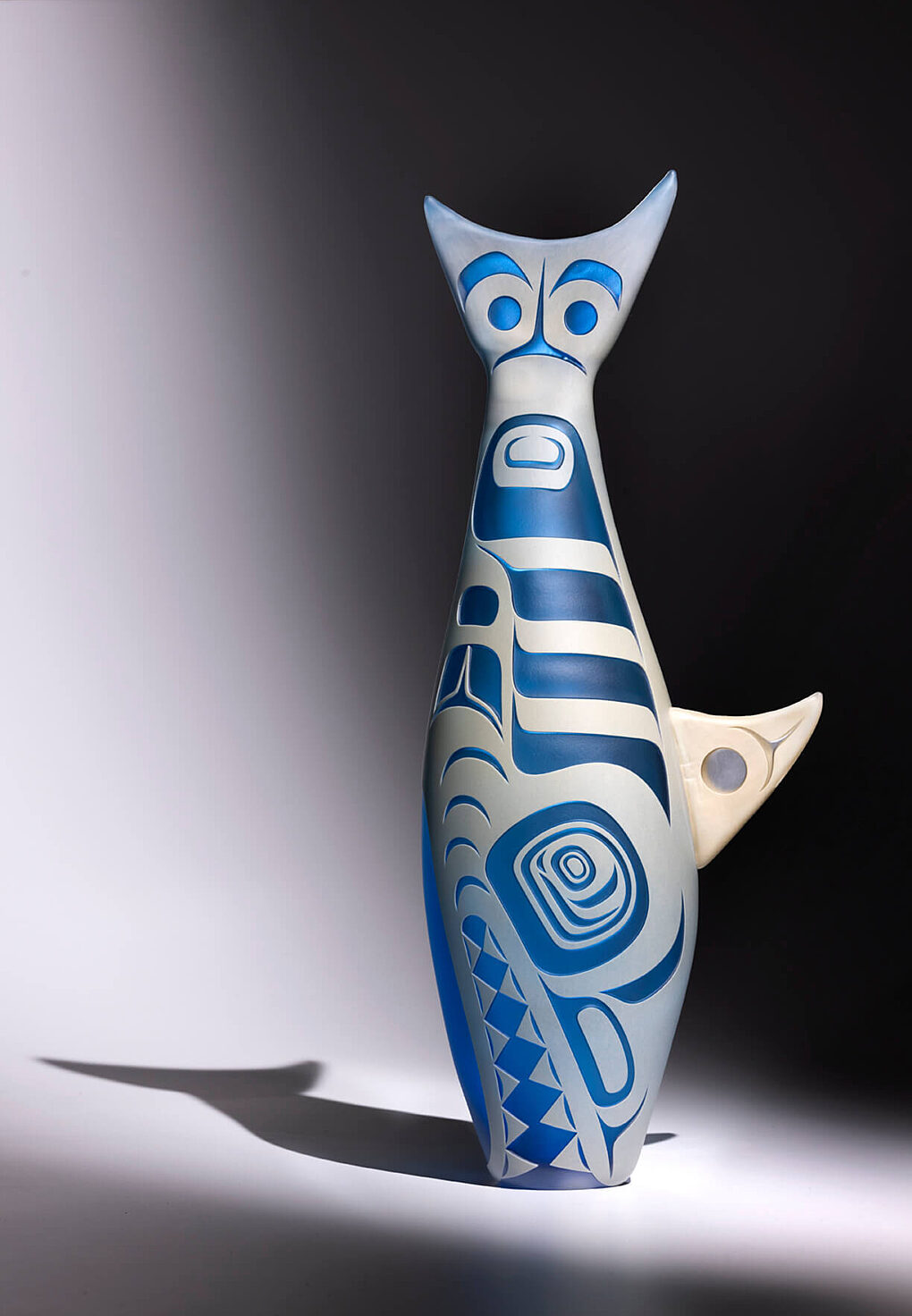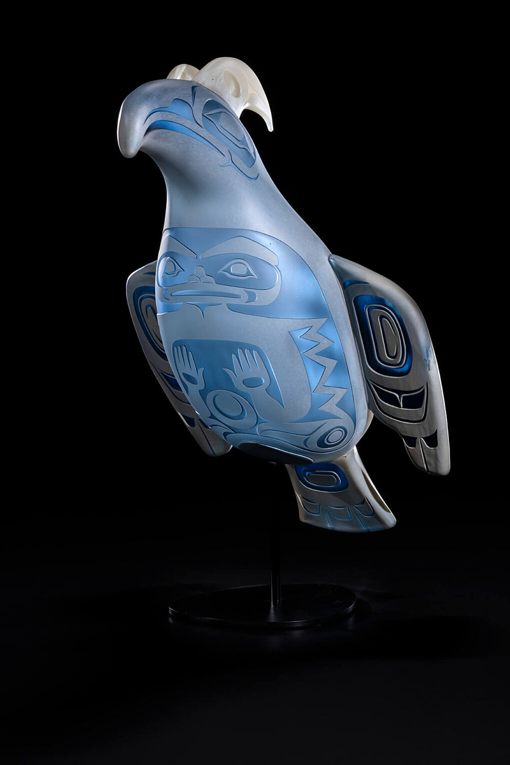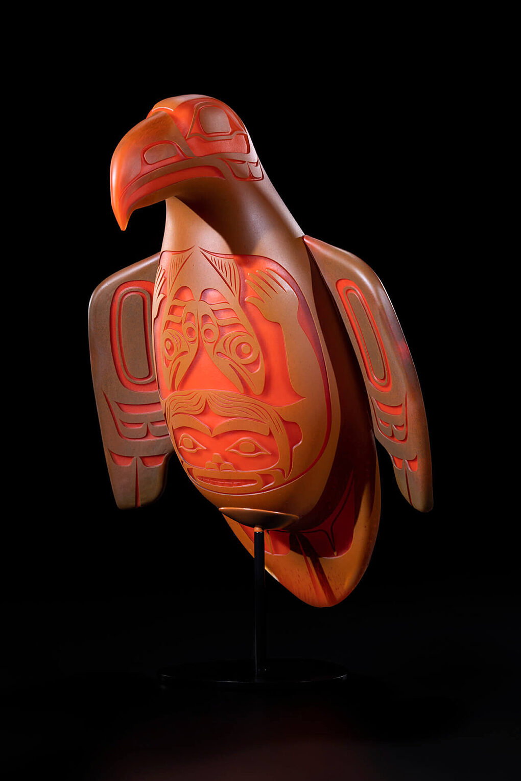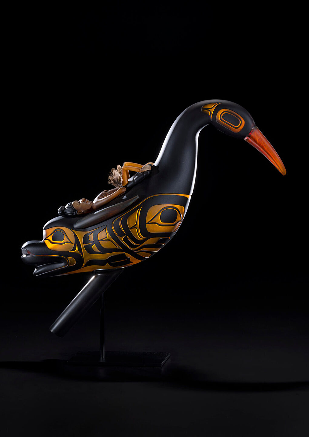 Many of the pieces explore new techniques I’ve been developing, such as encamo, sculptural forms and compositions, as well as expanding on stories of Thunderbirds, Eagles and an anthropomorphic Raven standing in the midst of rising tides."