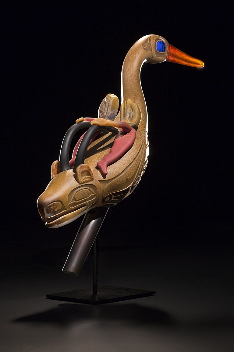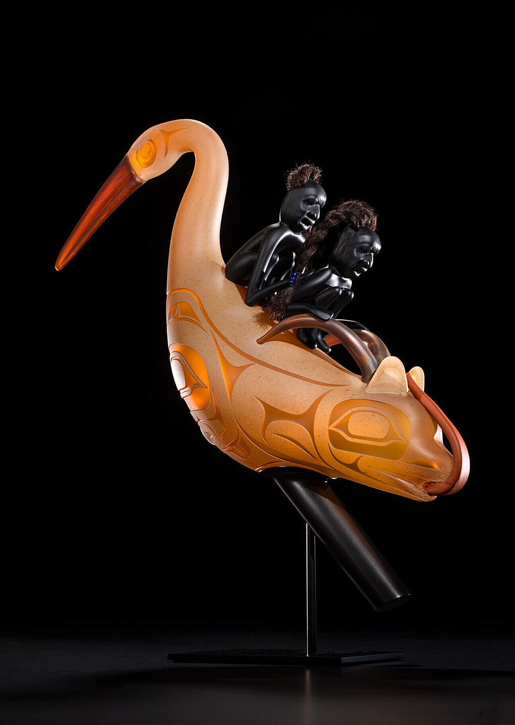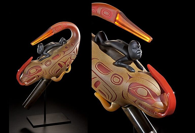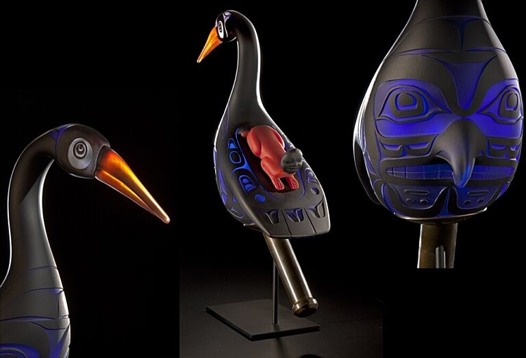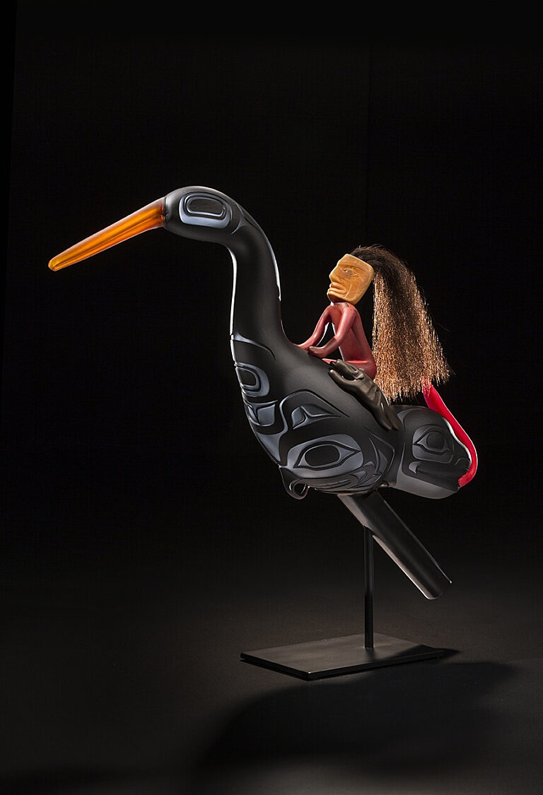 To Tlingit shaman inhabiting the northwest shores of North America, the oystercatcher inhabiting the border world between water and land was in parallel with the shaman's role between the human and spirit worlds. The oystercatcher is often depicted on rattles used by Tlingit shaman. These are several of Preston's favorite interpretations of the traditional rattles, which were originally carved from wood.