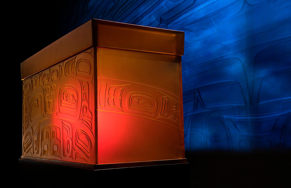 The story unfolds as visitors move through the exhibition’s four environments, while listening to recordings of storytellers paired with layers of original music and coastal Pacific Northwest soundscapes. Singletary’s exhibition creates a theatrical atmosphere in which his striking glass pieces connect with the narrative of Raven and the Box of Daylight.
